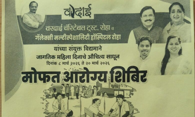 नुकत्याच संपन्न झालेल्या ८ मार्च या जागतिक महिला दिनाचे औचित्य साधून रोहा येथील वरदाई चारिटेबल ट्रस्ट व गॅलेक्सी मल्टीस्पेशालिटी हॉस्पिटल यांच्या संयुक्त विद्यमाने शनिवार दिनांक १४ मार्च रोजी सकाळी ११ ते दुपारी २ वाजण्याच्या दरम्यान नागोठणे ग्रामपंचायतीच्या सभागृहात मोफत आरोग्य शिबिराचे आयोजन करण्यात आले आहे. या मोफत आरोग्य शिबिराचा नागोठणे शहर व विभागातील नागरिकांनी लाभ घेण्याचे आवाहन आयोजकांकडून करण्यात आले आहे.